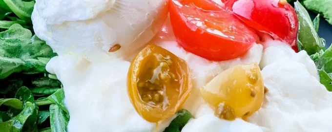 Η σαλάτα βασίζεται σε μαλακό, μαλακό τυρί burrata με κρεμώδη γέμιση, ζουμερές ντομάτες, ρόκα και ένα ντρέσινγκ από ελαιόλαδο και μπαλσάμικο.